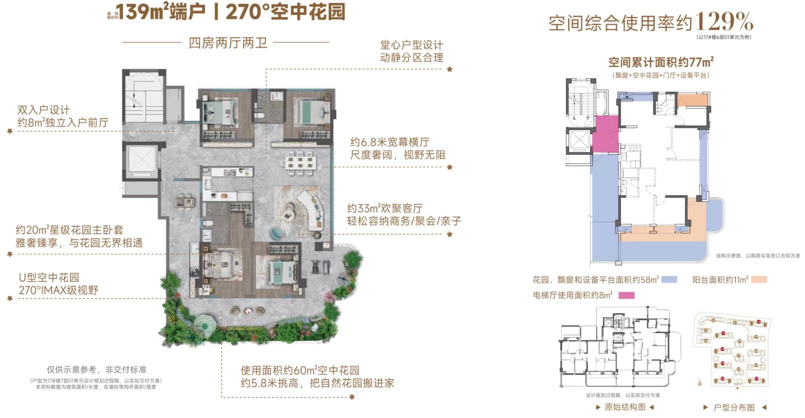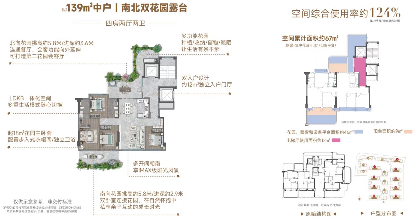 以139㎡中户为例,规划南北双花园露台,空间综合使用率约124%,空间累计利用面积约67㎡(合计拓展利用面积超170㎡),南北双向花园挑高约5.8米,进深约3.6米,连通餐厅,会客功能向外延伸,可打造第二花园可客厅;南向花园进深2.9米,双卧室连接花园,在自然怀抱中,私享亲子互动成长时光。
