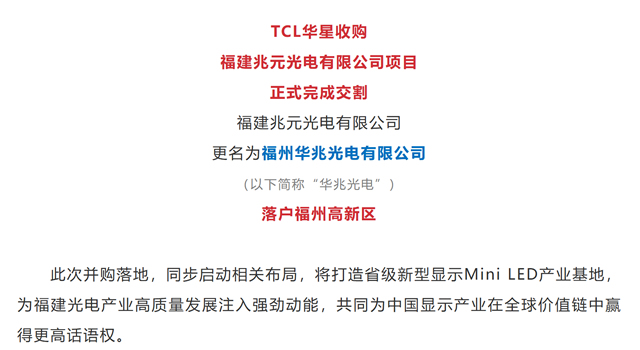 此次并购落地,同步启动相关布局,将打造省级新型显示Mini LED产业基地,为福建光电产业高质量发展注入强劲动能,共同为中国显示产业在全球价值链中赢得更高话语权。