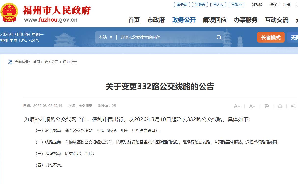 为填补斗顶路公交线网空白,便利市民出行,从2026年3月10日起延长332路公交线路,具体如下: