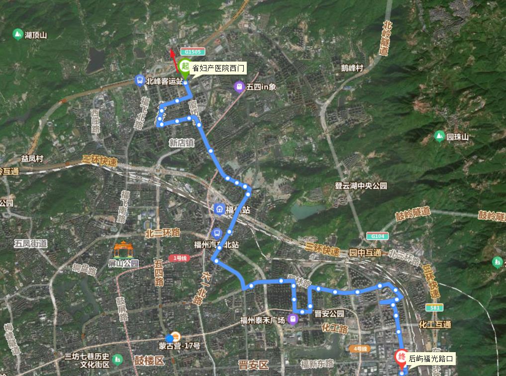 车辆由福新公交枢纽站发车,按原线路行驶至福兴湖塘站后改行拥上路、横屿路、东村路、鹤林路、安亭路、桂溪路、竹屿路、鹤林路、连江北路、北二环东路、沁河路、涧田路、玄南岭路、厦坊路、秀山路、龙头路、坂中路后到达省妇产医院西门站;返程车辆由省妇产医院西门站发车,途经坂中路、龙头路、秀山路、厦坊路、玄南岭路、涧田路、沁河路、北二环东路、连江北路、鹤林路、竹屿路、桂溪路、安亭路、鹤林路、东村路、横屿路、拥上路、福兴大道、福新东路、福光路后至福新公交枢纽站。