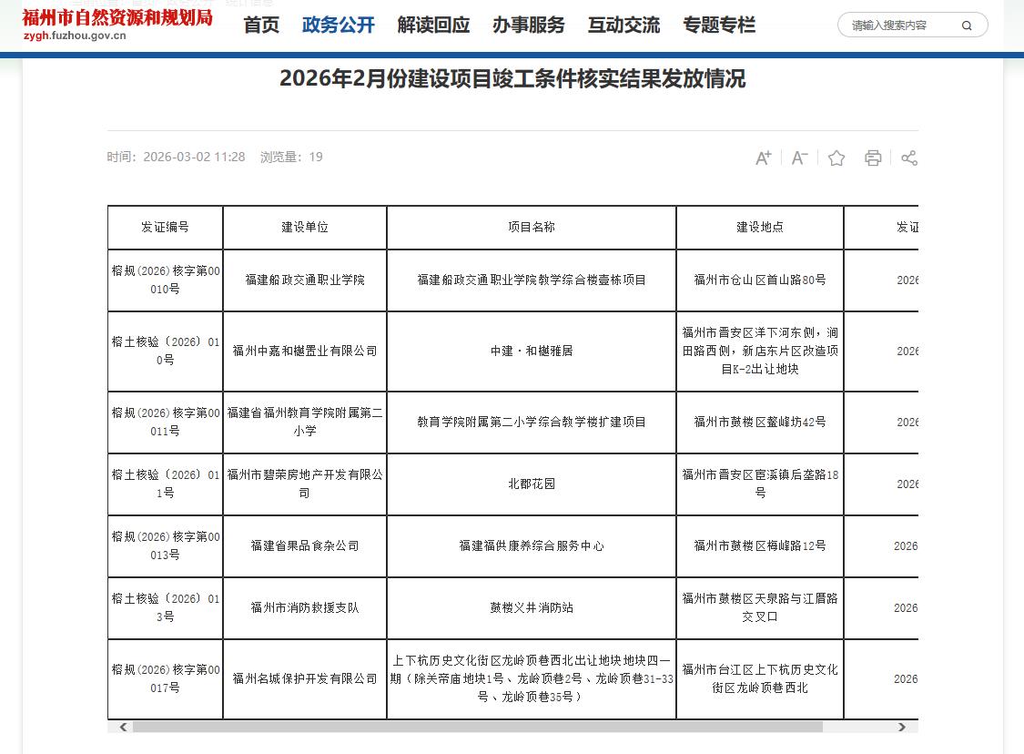 海西房产网(微信公众号:fjhxfcw)消息:2026年3月2日,福州市自然资源和规划局发布“2026年2月份建设项目竣工条件核实结果发放情况”。