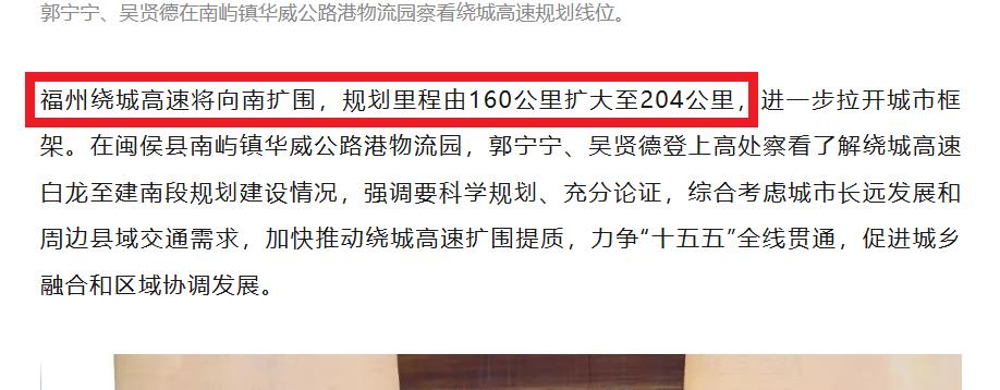 目前官方明确报道,绕城高速将向南扩围,里程由160 公里→204 公里,纳入福清、闽侯南屿、南通等区域,拉大城市框架。