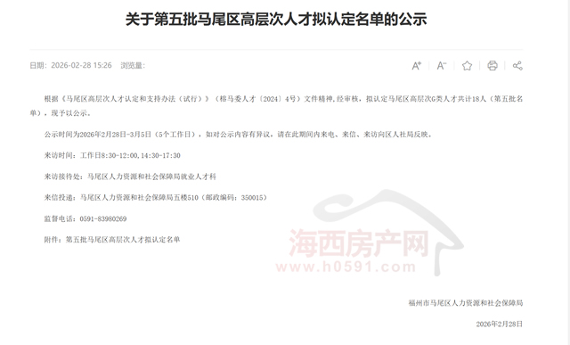 海西房产网(微信公众号:fjhxfcw)消息:2月28日,福州市马尾区人力资源和社会保障局发布“关于第五批马尾区高层次人才拟认定名单的公示”。