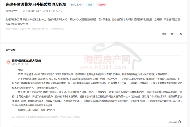 您好!欢迎通过人民网“领导留言板”留言!您留言反映“违建开窗没恢复且外墙破损也没修复”的事项,福州市晋安区鼓山镇人民政府进行了调查处理。