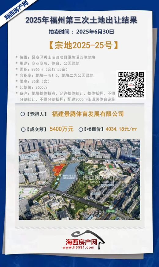 其中的宗地2025-25号,被福建景腾体育发展有限公司以0.54亿元竞得(楼面地价4512元/平方米)。