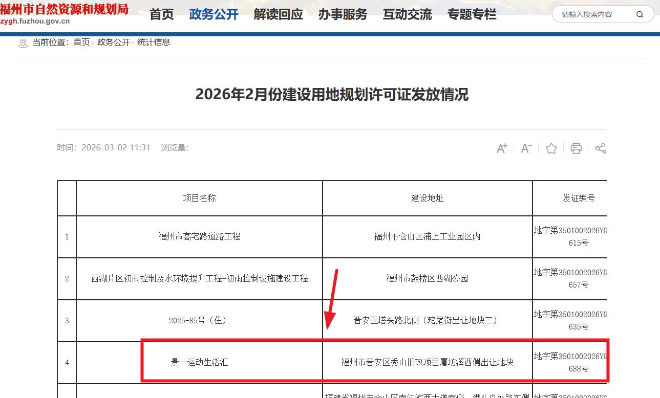 位于五四北片区的“景一运动生活汇”,已取得建设用地规划许可,项目位于福州市晋安区秀山旧改项目厦坊溪西侧出让地块, 总用地面积8366平方米,建设单位为福建景腾体育发展有限公司,发证编号地字第3501002026YG0029688号 , 发证日期为2月13日。