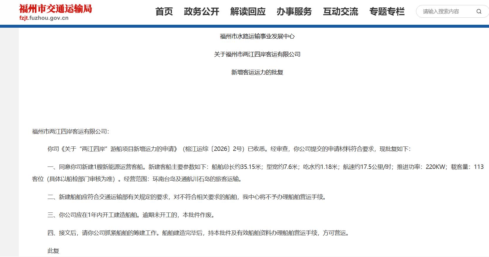 福州市两江四岸客运有限公司《关于“两江四岸”游船项目新增运力的申请》(榕江运综〔2026〕2号)已收悉。经审查,你公司提交的申请材料符合要求,现批复如下: