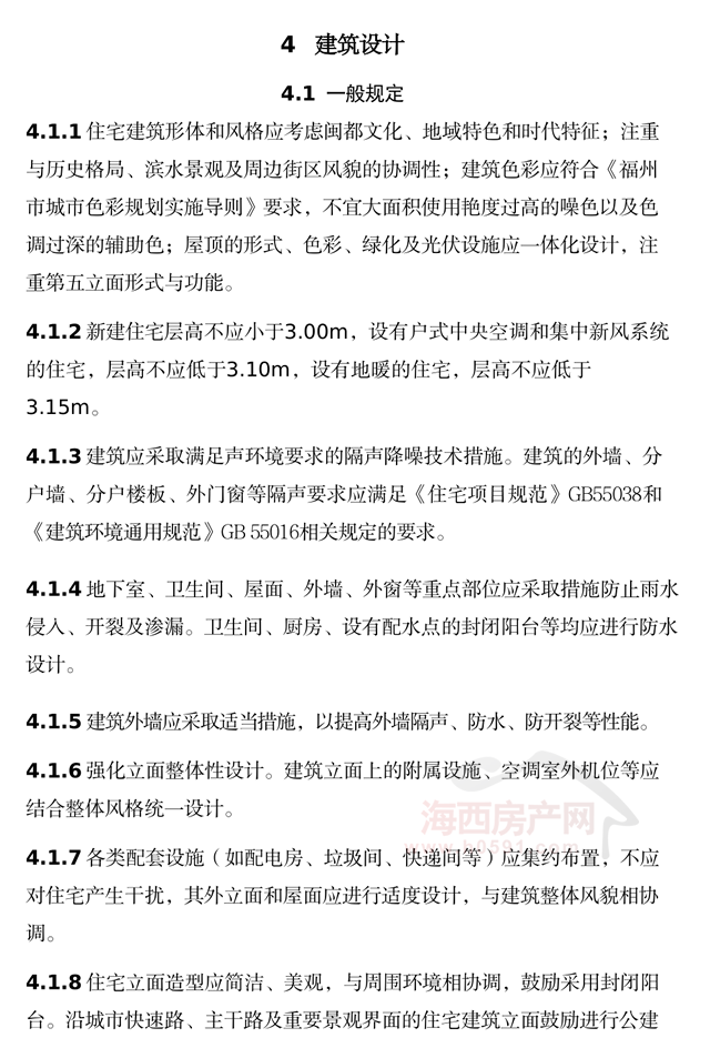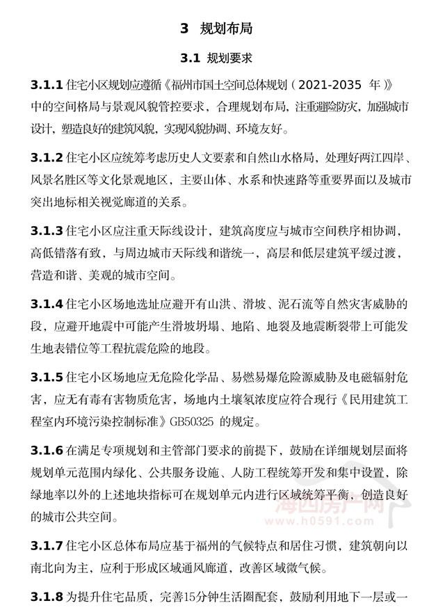 福州市高品质住宅设计导则(试行)明确,住宅小区规划应遵循《福州市国土空间总体规划(2021-2035 年)》中的空间格局与景观风貌管控要求,合理规划布局,注重避险防灾,加强城市设计,塑造良好的建筑风貌,实现风貌协调、环境友好。