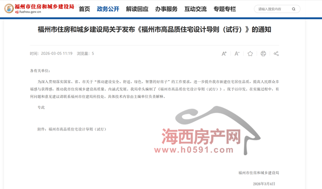 海西房产网(微信公众号:fjhxfcw)消息:3月5日,福州市住房和城乡建设局下发“关于发布《福州市高品质住宅设计导则(试行)》的通知”。