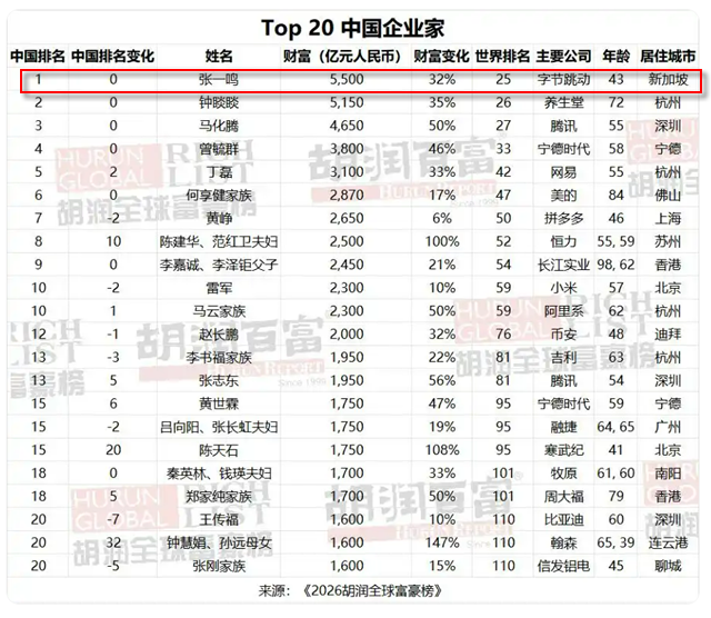 3月5日,胡润研究院发布《2026胡润全球富豪榜》。字节跳动创始人张一鸣(福建龙岩人)以5500亿元人民币财富蝉联中国首富,财富增长32%。