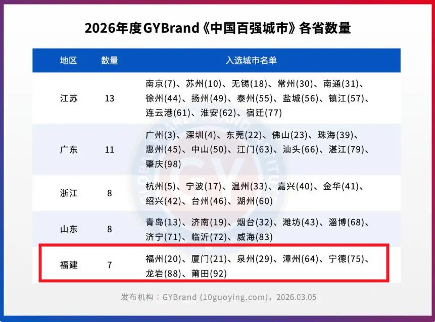 福建7个城市:福州(20)、厦门(21)、泉州(29)、漳州(64)、宁德(75)、龙岩(88)、莆田(92)