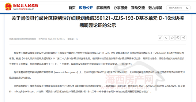 公示内容显示,闽侯县委托福建省城乡规划设计研究院编制的《闽侯县竹岐片区控制性详细规划修编350121-JZJS-193-D基本单元D-16地块控规调整论证》于2026年3月4日通过专家技术审查。