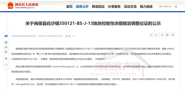 公示内容显示,闽侯县委托福州市规划设计研究院集团有限公司编制的《闽侯县白沙镇350121-BS-J-13地块控制性详细规划调整论证》已于2026年2月5日通过专家技术审查。