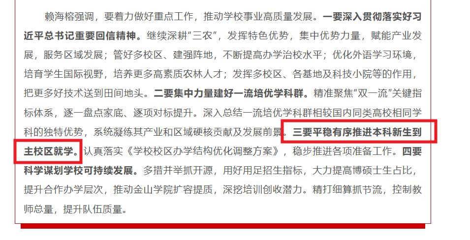 要平稳有序推进本科新生到主校区就学。认真落实《学校校区办学结构优化调整方案》,稳步推进各项准备工作。