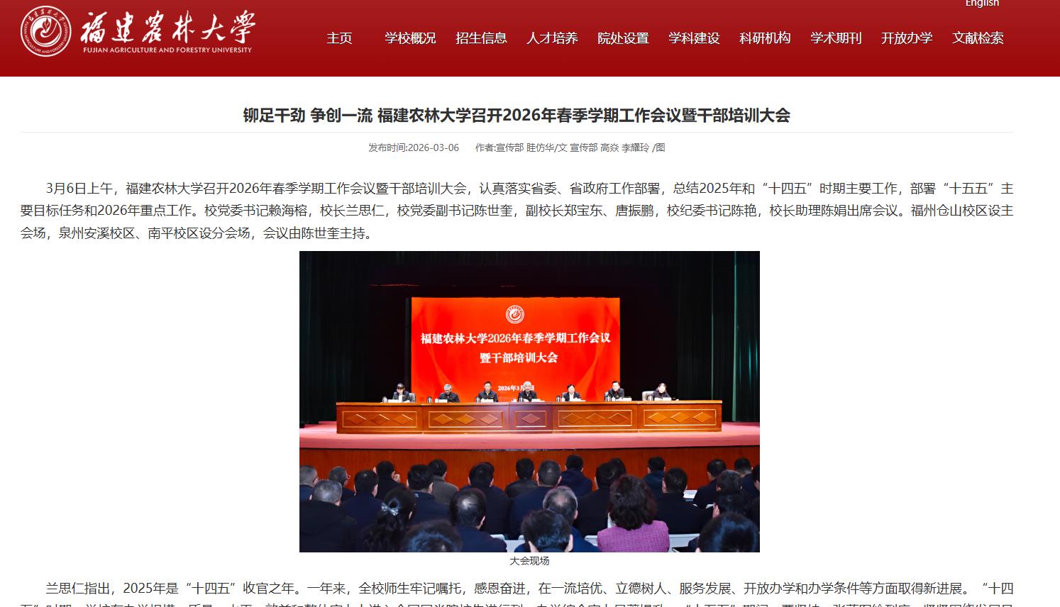 校长兰思仁对2026年学校十项重点工作进行安排部署。透露 福建农林大学将全力冲刺新一轮“双一流”。融合发展再聚力,推动两校教育资源有效整合。