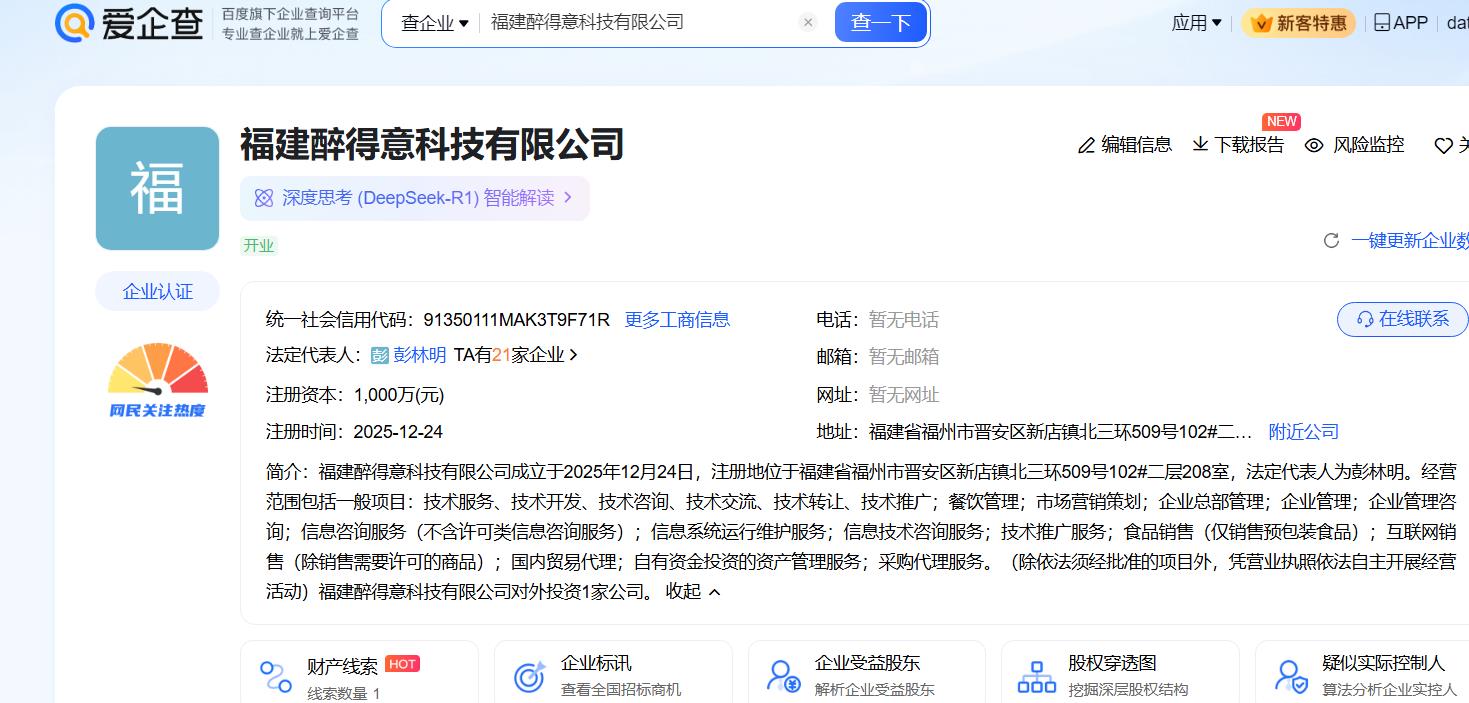 福建醉得意科技有限公司成立于2025年12月24日,注册地位于福建省福州市晋安区新店镇北三环509号102#二层208室,法定代表人为彭林明。