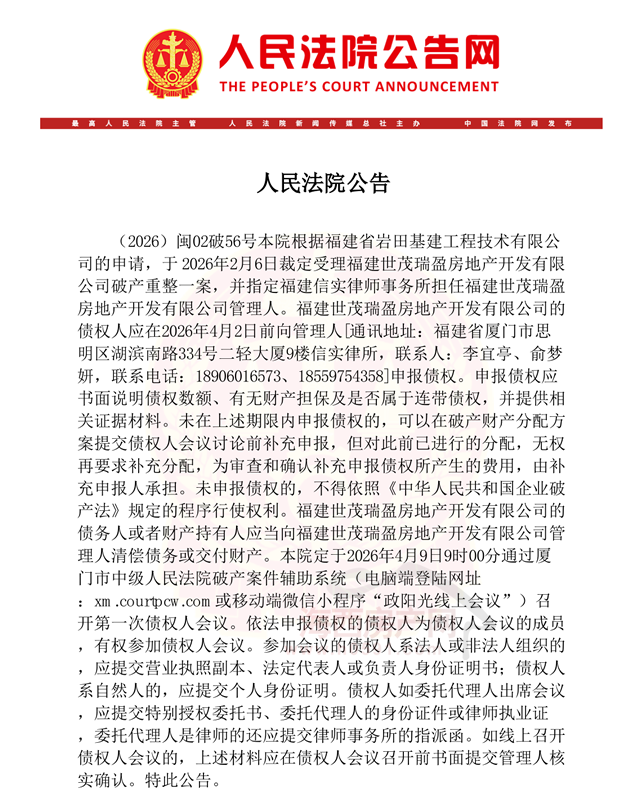 公告显示,厦门市中级人民法院根据福建省岩田基建工程技术有限公司的申请,于2026年2月6日裁定受理福建世茂瑞盈房地产开发有限公司破产重整一案,并指定福建信实律师事务所担任福建世茂瑞盈房地产开发有限公司管理人。