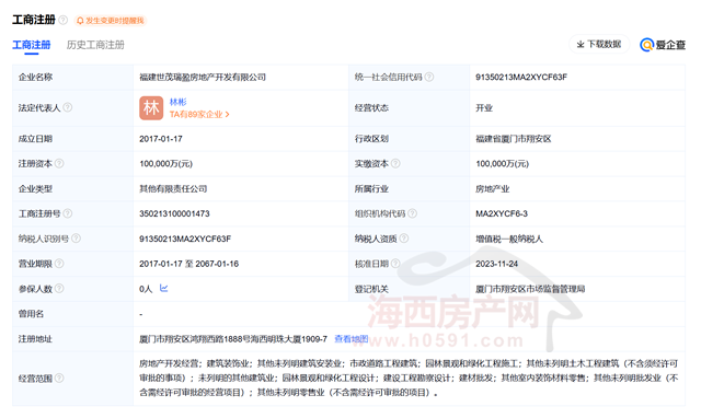 爱企查资料显示,福建世茂瑞盈房地产开发有限公司成立于2017年01月17日,注册地位于厦门市翔安区鸿翔西路1888号海西明珠大厦1909-7,法定代表人为林彬。