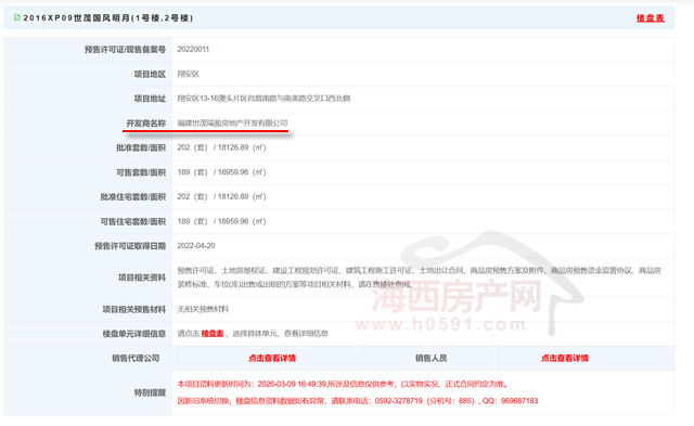 厦门网上房地产平台公布信息显示,福建世茂瑞盈房地产开发有限公司开发厦门翔安区“世茂国风明月项目”。