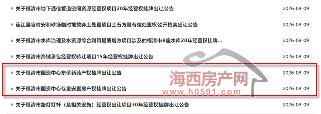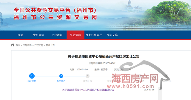 3月9日,福清市公共资源交易服务中心发布“关于福清市国资中心东侨新苑产权挂牌出让公告”。