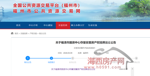 3月9日,福清市公共资源交易服务中心发布“关于福清市国资中心存量安置房产权挂牌出让公告”。