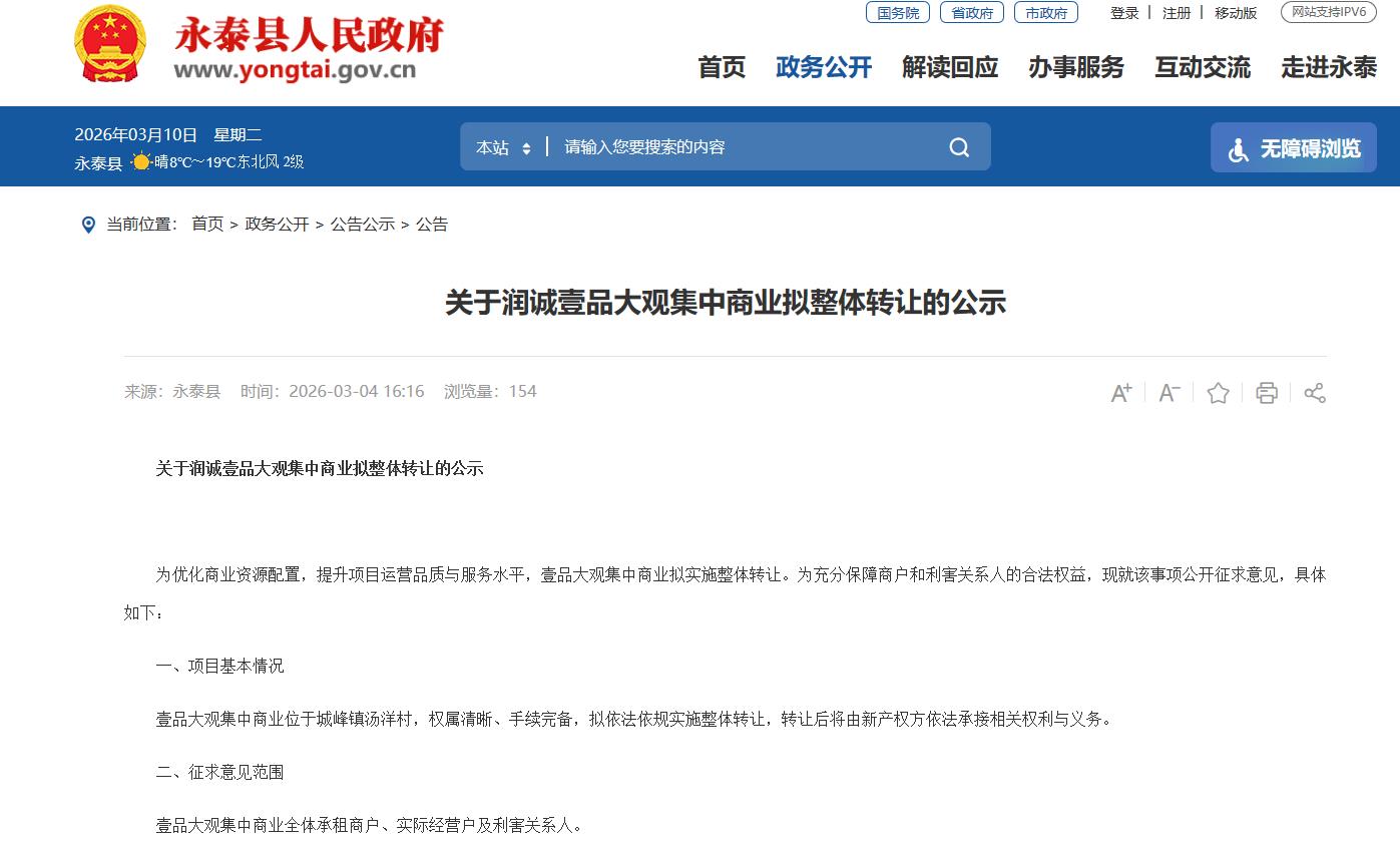 海西房产网(微信公众号:fjhxfcw)消息:2026年3月4日,永泰县自然资源和规划局发布“关于润诚壹品大观集中商业拟整体转让的公示”。