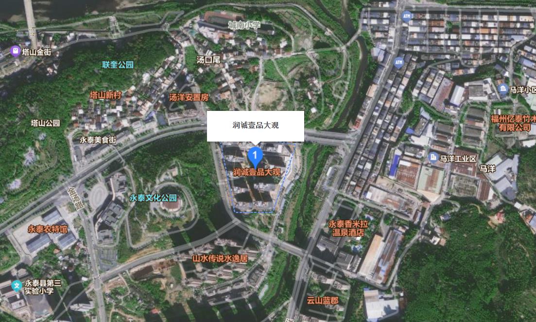 永泰润诚壹品大观位于永泰县城峰镇汤洋村(六馆一中心旁,站前大道与洋亭路交汇处),属于城南核心板块;开发商是福建润邦置业有限公司。周边有山水传说、水韵府、世茂温泉小镇等多个成熟小区,同时紧邻 “六馆一中心” 公共配套。