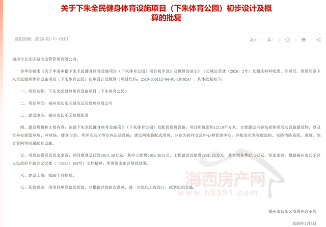 海西房产网(微信公众号:fjhxfcw)消息:近日,福州市长乐区发展和改革局发布“关于下朱全民健身体育设施项目(下朱体育公园)初步设计及概算的批复”。