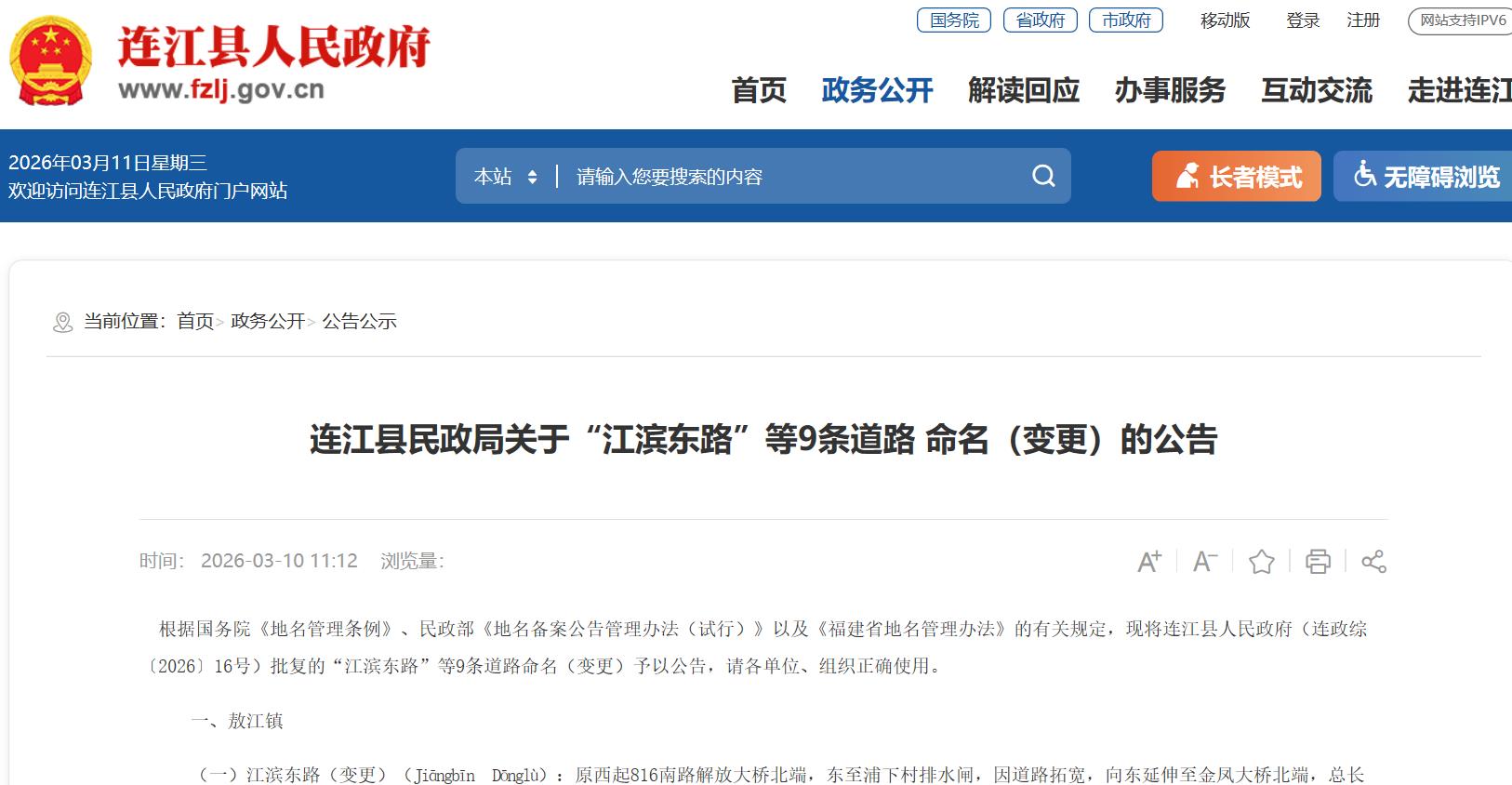 2026年3月10日,连江县民政局发布关于“江滨东路”等9条道路 命名(变更)的公告。