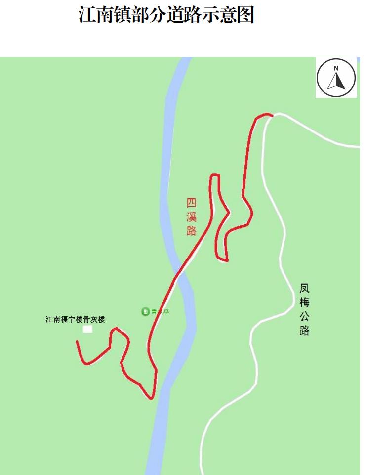 (三)四溪路(Sìxī Lù):东北起凤梅公路,西南至江南福宁楼骨灰楼,长约1100米,宽约4.5米。因道路所处位置在历史地名第四溪,命名为“四溪路”。