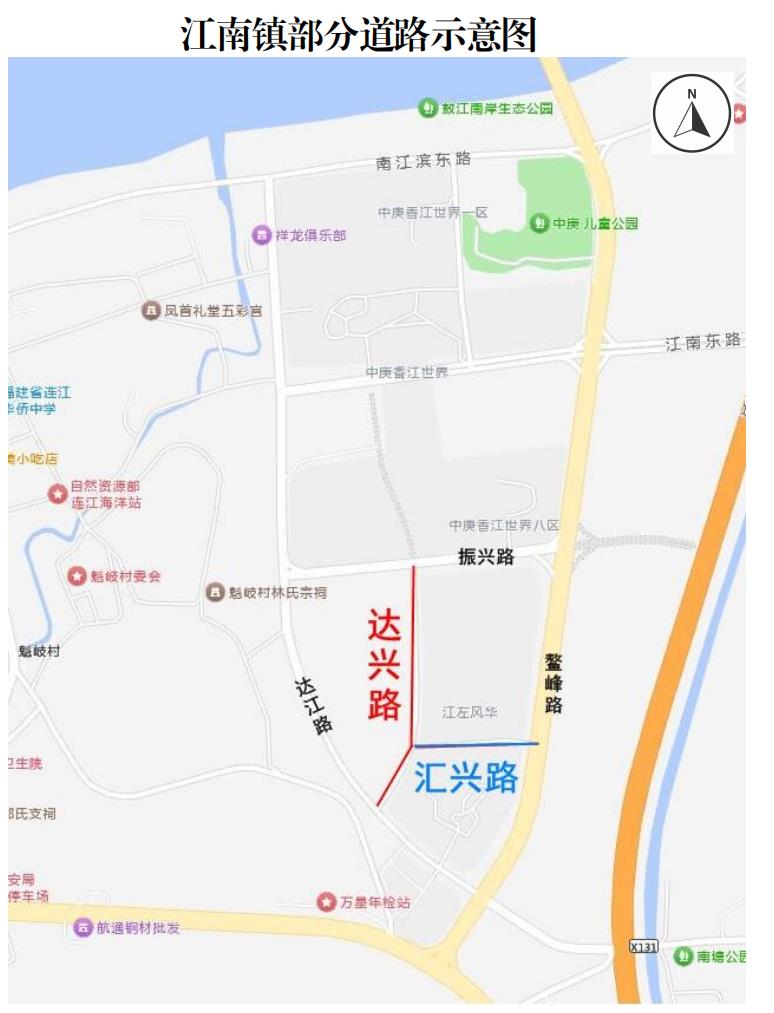 (一)达兴路( Dáxīng Lù):南起达江路,北至振兴路,长约400米,宽约10米,道路位于江左风华小区西侧,寓意江南新城规划发展“百业畅达、万象兴盛”,命名为“达兴路”。