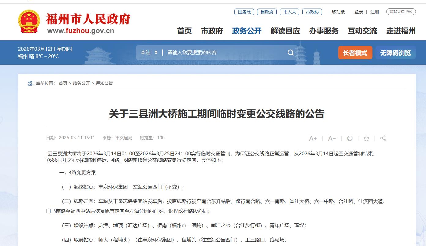 2026年3月11日,福州市道路运输事业发展中心发布“关于三县洲大桥施工期间临时变更公交线路的公告”。