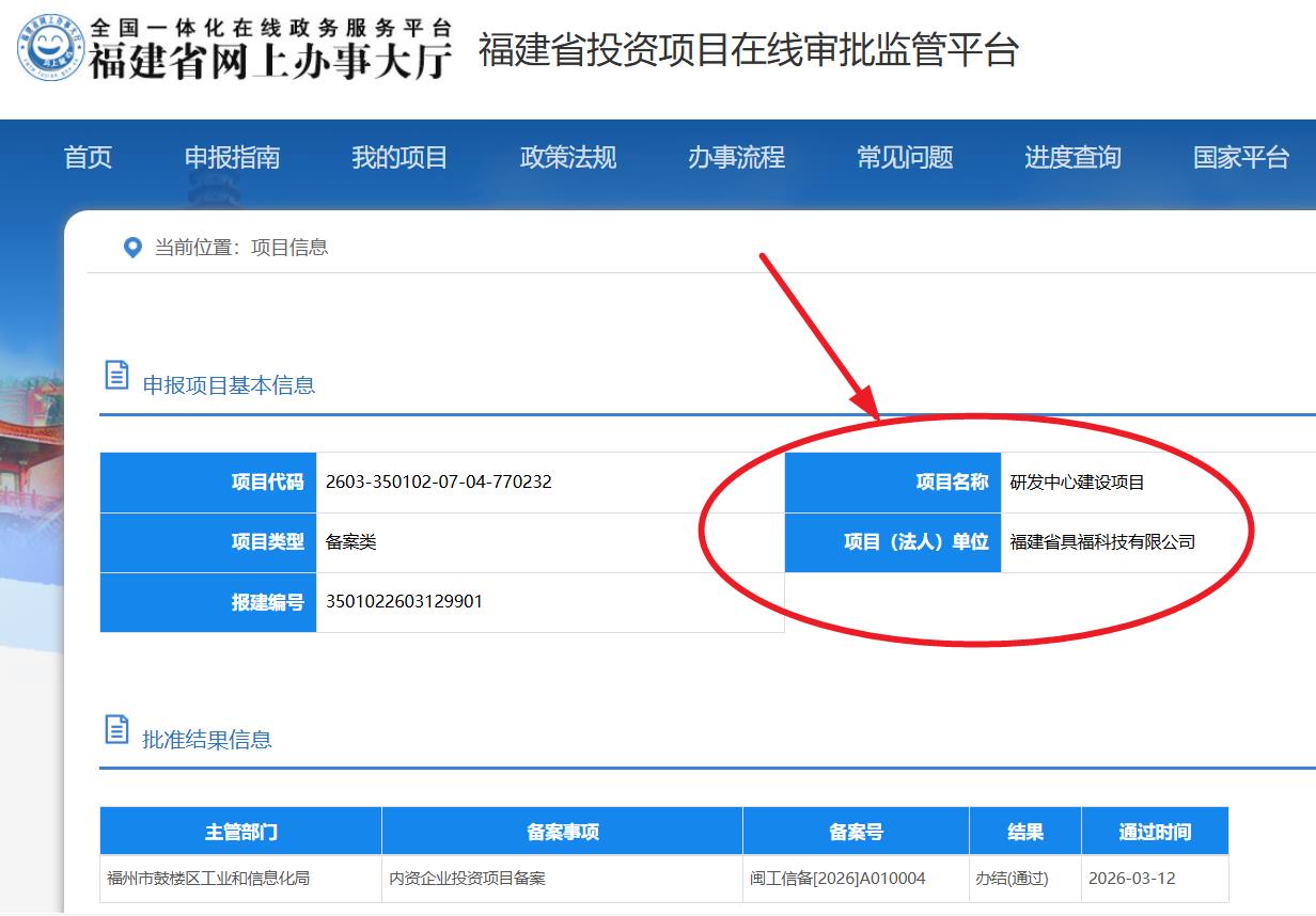 海西房产网(微信公众号:fjhxfcw)消息:福建省投资项目在线审批监管平台发布信息显示,“研发中心建设项目”已于2026年3月12日取得内资企业投资项目备案,批准结果信息为办结(通过)。