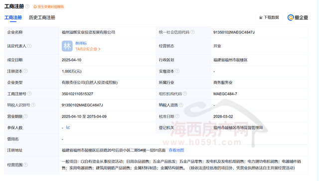 爱企查资料显示,福州溢辉实业投资发展有限公司成立于2025年04月10日,注册地位于福建省福州市鼓楼区后县路20号后县小区二期5#楼一层01店面,法定代表人为林祥标。