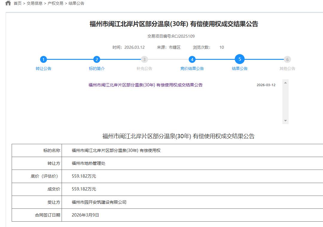 福州市园开安筑建设有限公司以底价559.182万元,拿下福州市闽江北岸片区部分温泉(30年) 有偿使用权。转让方为福州市地热管理处,合同签订日期为2026年3月9日。
