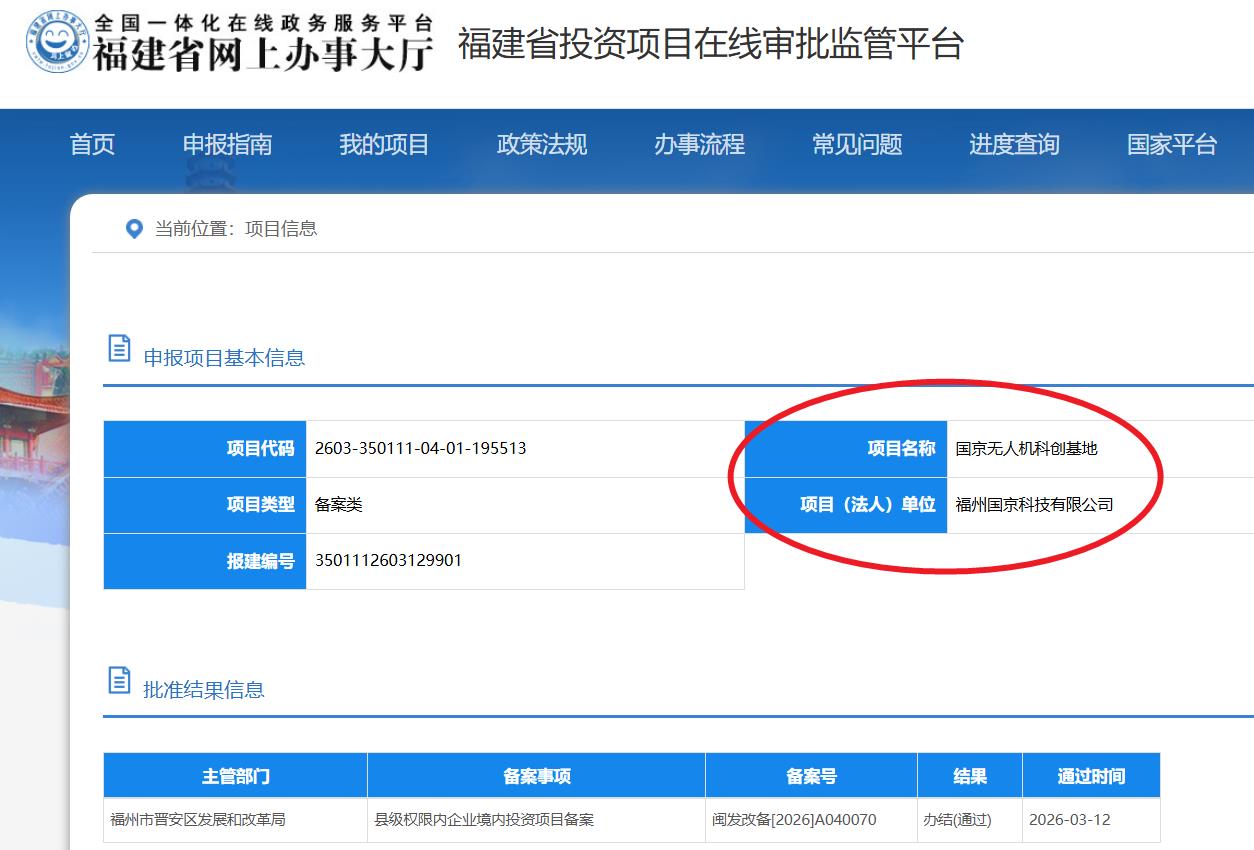 海西房产网(微信公众号:fjhxfcw)消息:福建省投资项目在线审批监管平台发布信息显示,“国京无人机科创基地”已于2026年3月12日取得县级权限内企业境内投资项目备案,批准结果信息为办结(通过)。