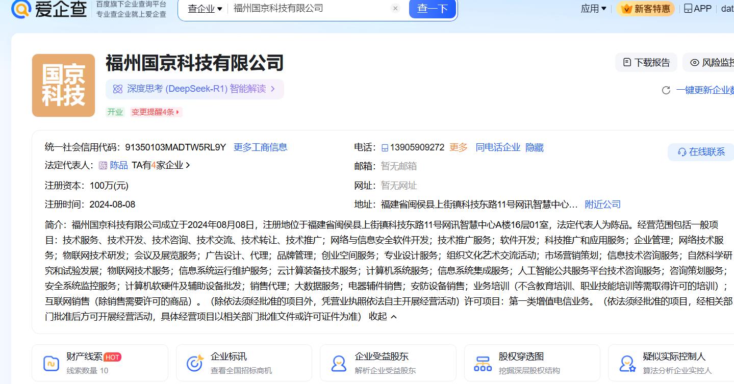 爱企查平台显示,福州国京科技有限公司成立于2024年08月08日,注册地位于福建省闽侯县上街镇科技东路11号网讯智慧中心A楼16层01室,法定代表人为陈品。