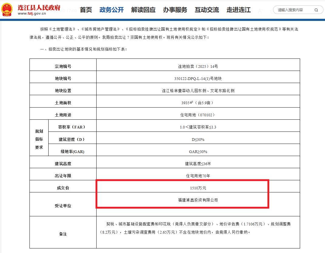 2025年12月10日,连江县举行当年第11次土拍活动。福建浦鑫投资有限公司以底价1510万元,摘得连地拍卖[2025]14号(地块编号:350122-DPQ-L-14(1)号地块),楼面价约2952元/平米。