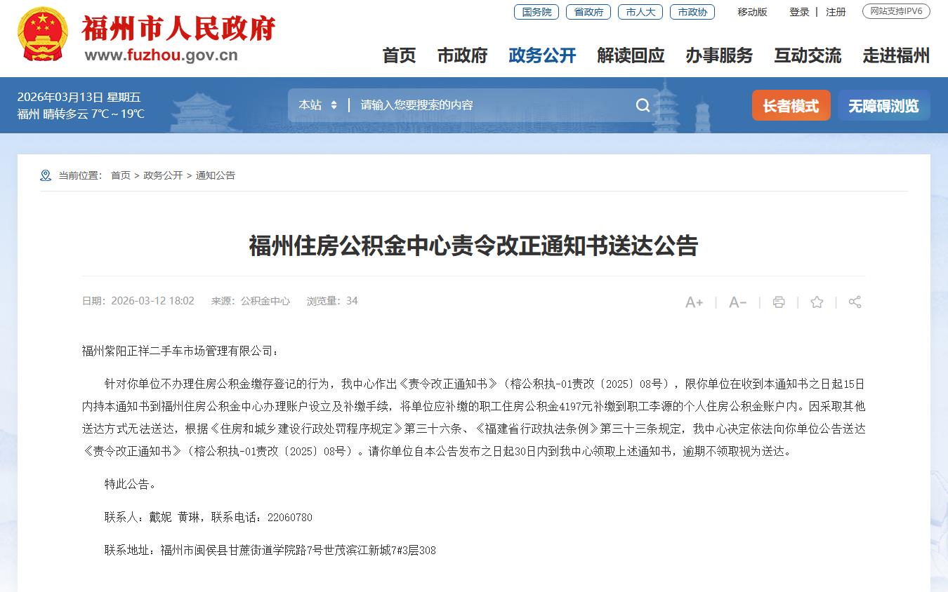 海西房产网(微信公众号:fjhxfcw)消息:2026年3月10日,福州住房公积金中心发布一则责令改正通知书送达公告。