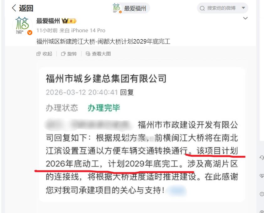 海西房产网(微信公众号:fjhxfcw)消息:据微博大V“最爱福州”发文透露了闽都大桥(前横闽江大桥)的开工及竣工时间。