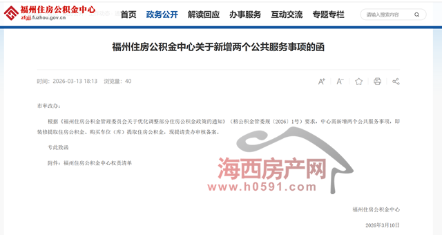 据《福州住房公积金管理委员会关于优化调整部分住房公积金政策的通知》(榕公积金管委规〔2026〕1号)要求,中心需新增两个公共服务事项,即装修提取住房公积金、购买车位(库)提取住房公积金,现提请市审改办审核备案。