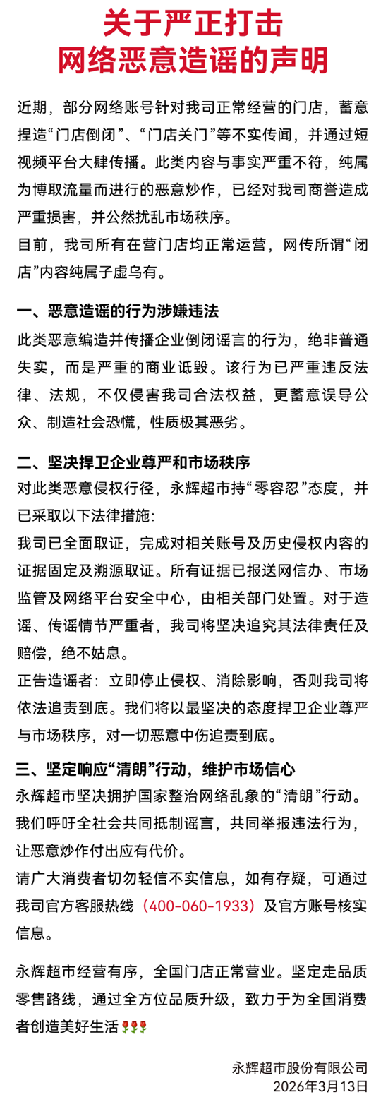 在官方声明中,永辉超市表示,近期,部分网络账号针对我司正常经营的门店,蓄意捏造"门店倒闭","门店关门"等不实传闻,并通过短视频平台大肆传播。此类内容与事实严重不符,纯属为博取流量而进行的恶意炒作,已经对我司商誉造成严重损害。