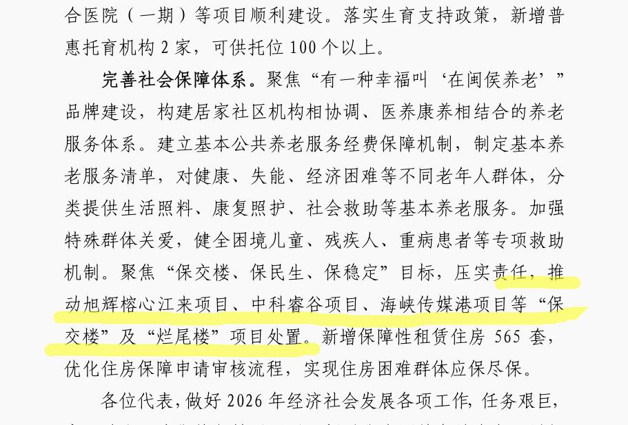 在2026年国民经济和社会发展主要预期目标和任务中,官方提出将完善社会保障体系,聚焦“保交楼、保民生、保稳定”目标,压实责任,推动旭辉榕心江来项目、中科睿谷项目、海峡传媒港项目等“保交楼”及“烂尾楼”项目处置。