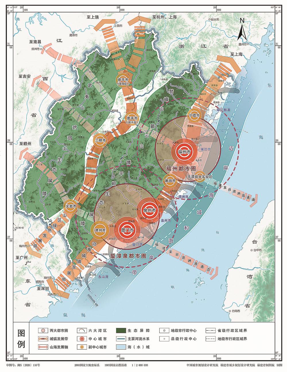 “两极两带三轴六湾区”城镇发展格局:“两极”即福州都市圈、厦漳泉都市圈发展极;“两带”即沿海城镇发展带、山区绿色发展带;“三轴”即三条山海联动发展轴,包括北部福州宁德至南平发展轴、南部厦门漳州至龙岩发展轴、中部泉州莆田至三明发展轴;“六湾区”即环三都澳、闽江口、湄洲湾、泉州湾、厦门湾、东山湾六大湾区。