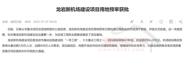 据《闽西日报》报道,龙岩新机场建设项目用地预审已于2025年7月顺利通过福建省自然资源厅审核,并获正式批复。