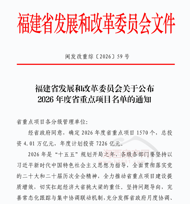 2026年2月5日,福建省发展和改革委员会下发“关于公布2026年度省重点项目名单的通知”。