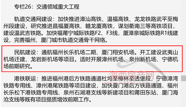 民航建设:通航福州长乐机场二期、厦门翔安机场。开工建设武夷山机场迁建、龙岩新机场等项目。适时开展漳州机场、泉州新机场、宁德机场前期研究。