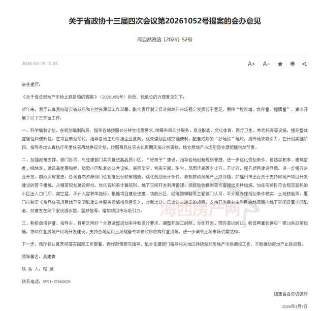 海西房产网(微信公众号:fjhxfcw)消息:3月19日,福建省自然资源厅官网刊发“关于省政协十三届四次会议第20261052号提案的会办意见”。