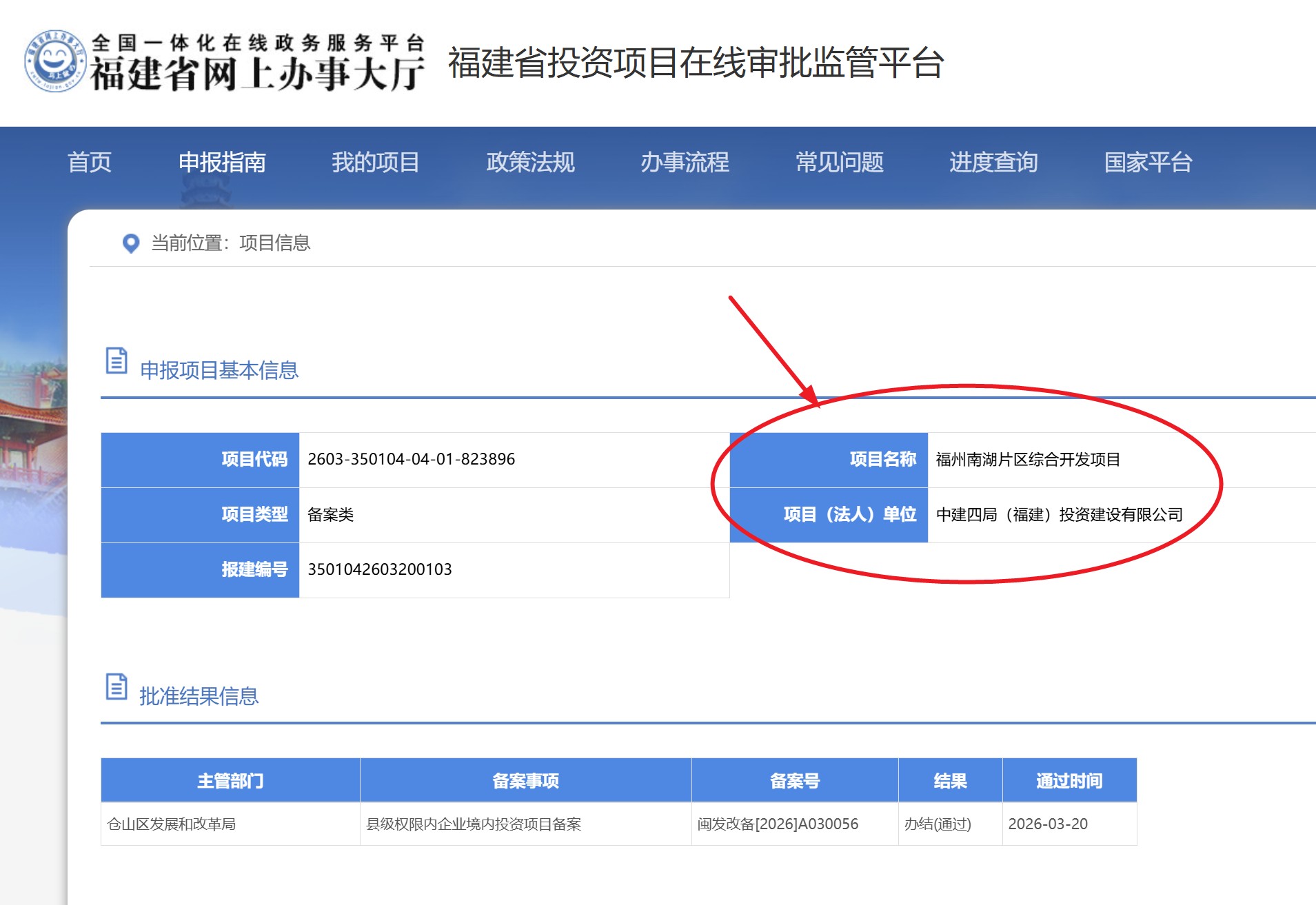 项目报建编号3501042603200103,项目(法人)单位为中建四局(福建)投资建设有限公司,备案号闽发改备[2026]A030056 。主管部门为福州市仓山区发展和改革局。