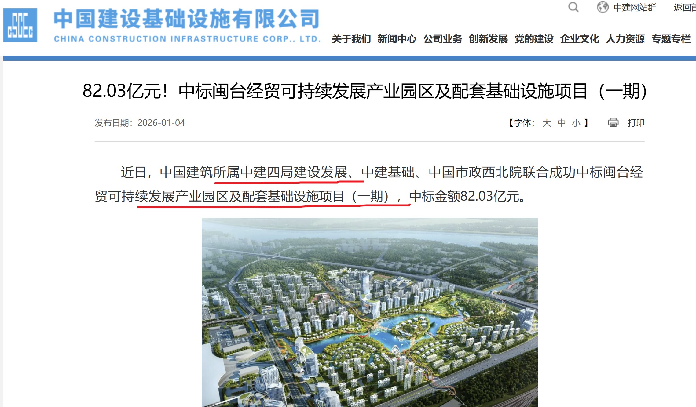 据中国建筑基础设施有限公司2026年1月4日报道 ,中国建筑所属中建四局建设发展、中建基础、中国市政西北院联合成功中标闽台经贸可持续发展产业园区及配套基础设施项目(一期),中标金额82.03亿元。
